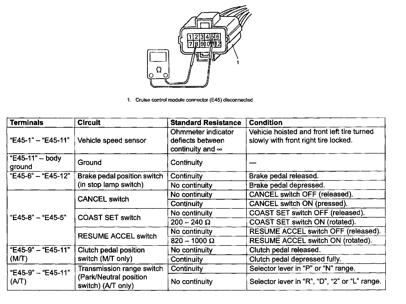 CAUTION: Never touch terminals of cruise control module itself or connect voltmeter or ohmmeter.