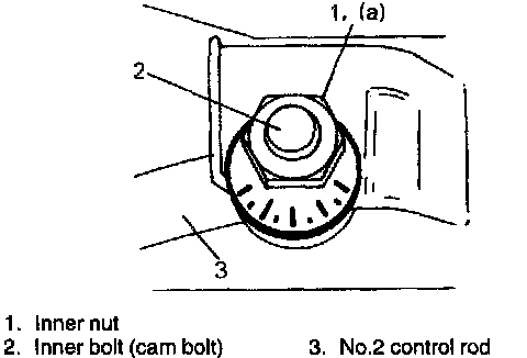 2. Adjust toe to satisfy specification by turning right and left No.2 control rod inner bolts (cam bolts) by the same amount.