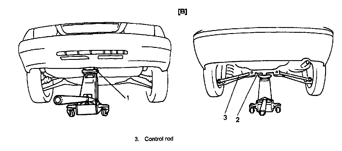 - Never apply jack against suspension parts (i.e., stabilizer, etc.) or vehicle floor, or it may get deformed.