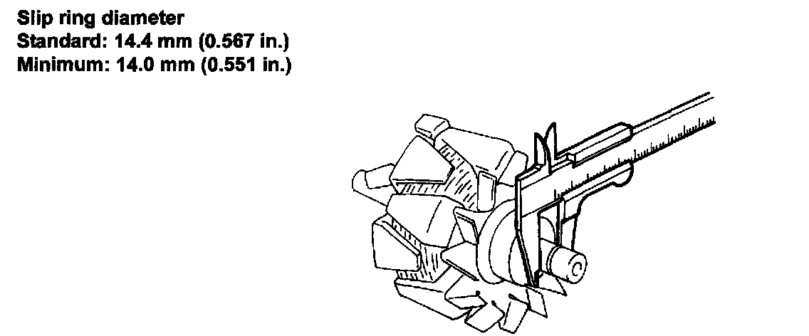 - Using a vernier caliper, measure the slip ring diameter. If the diameter is less than minimum, replace the rotor.
