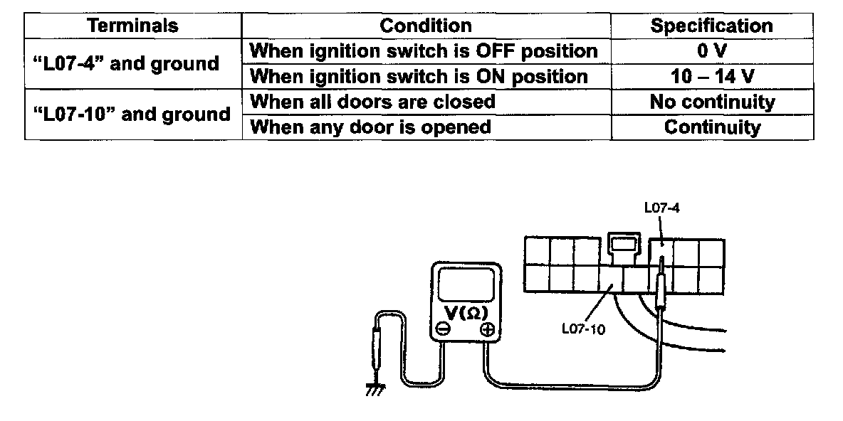 Ignition Switch and Door Switch Circuit Inspection1. Disconnect negative cable at battery.