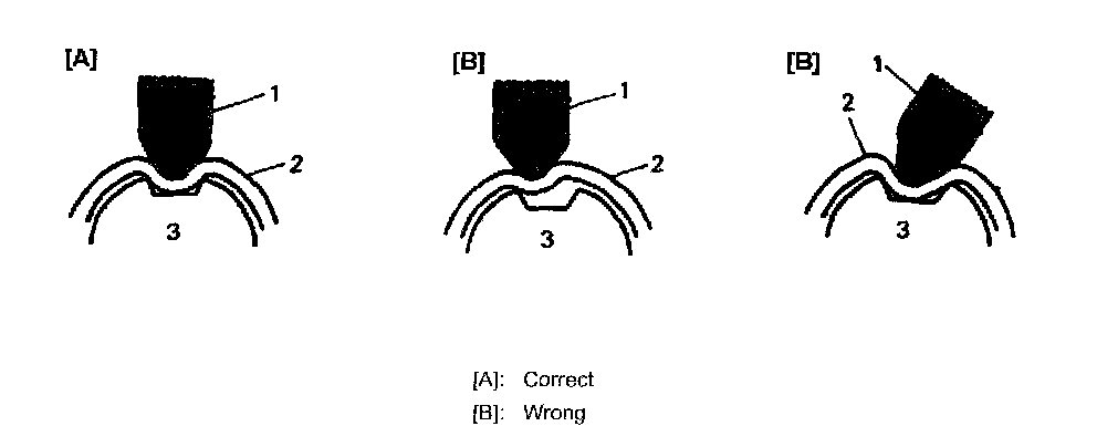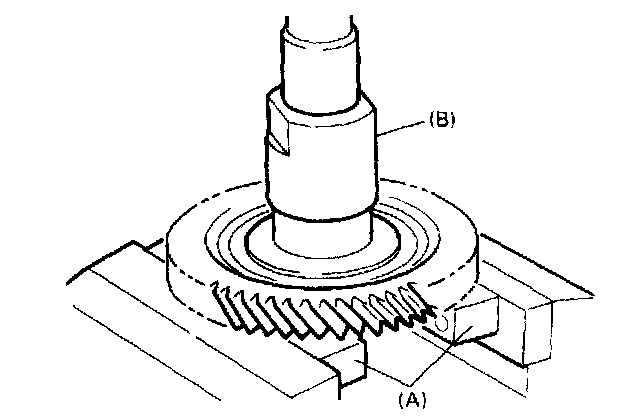 NOTE: When staking lock nut for output shaft speed sensor, point a suitable staking tool (1) toward differential drive pinion shaft (3) axis center and stake lock nut securely, as shown in the figure. (Poor staking may cause abnormal noise.)