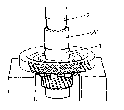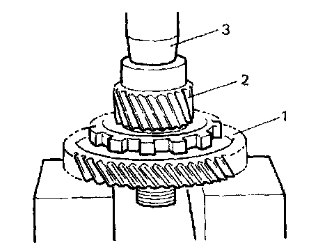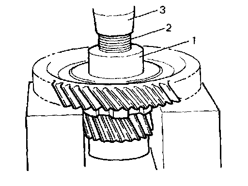 1. Press differential drive pinion (2) to counter driven gear (1), using hydraulic press (3).