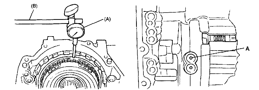 16. Install special tools on transmission. Measure 1st and reverse brake piston stroke by applying and releasing compressed air (400 - 800 kPa, 4 - 8 kgf/cm2, 57 - 113 psi) through oil hole section (A).