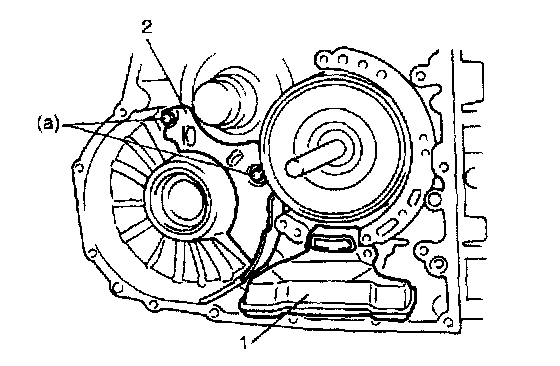 41. Check for correct installation of each component parts as follows. Measure the distance "a" by using vernier (1) and straightedge (2). If out of specification, remove forward clutch, overdrive/coast clutch, front and rear planetary carrier and reinstall them properly.