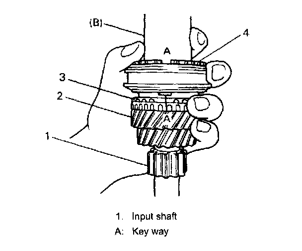 ^ While press-fitting sleeve and hub, make sure that synchronizer ring key slots are aligned with keys in sleeve and hub assembly.