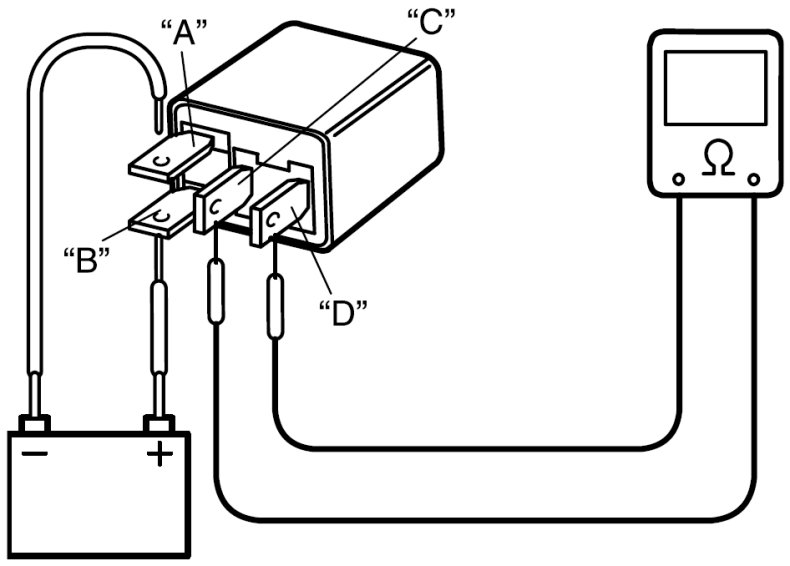 1. Check that there is no continuity between terminal "C" and "D". If there is continuity, replace relay.