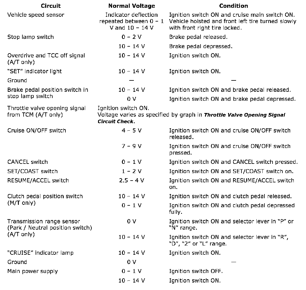 Check for input or output voltage of control module (voltage between each circuit and body ground) with cruise control module connector connected.