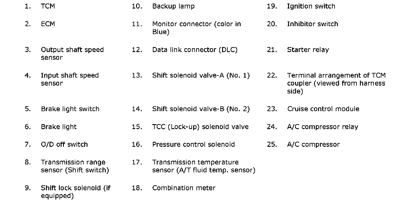 The TCM is an electronic circuit component that controls gear shift and idle-up according to the signal from each sensor. It is a microcomputer of an IC, transistor, diode, etc. It is installed at the right side of the steering column.