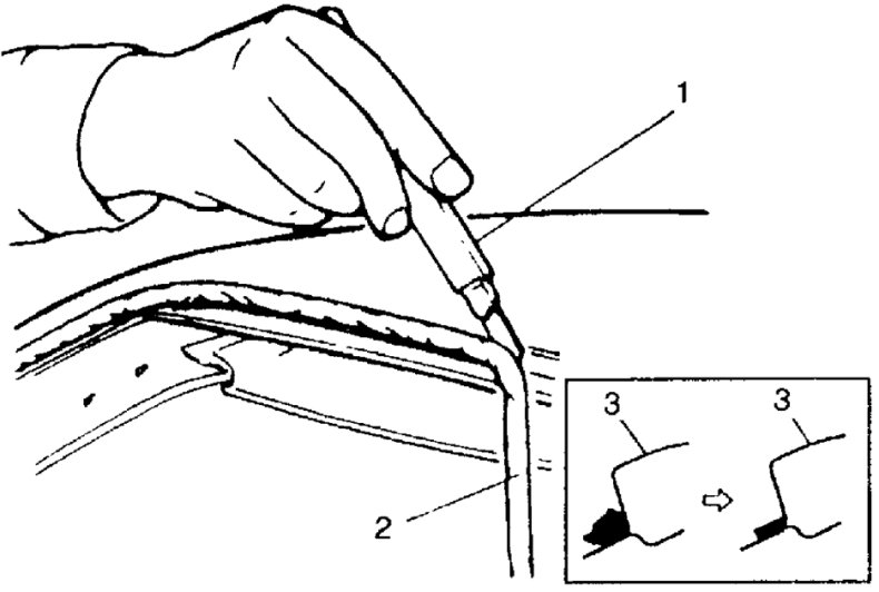 10. Using knife (1), smoothen adhesive (2) remaining on body side (3) so that it is 1 - 2 mm (0.039 - 0.078 in.) thick all around.