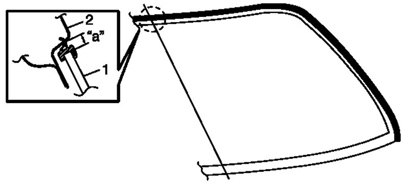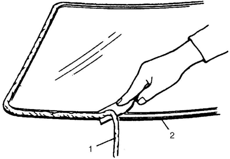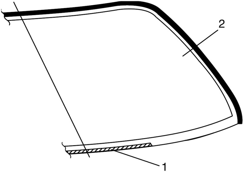 11. When reusing windshield, remove the adhesive (1) from it, using care not to damage primer coated surface (2).