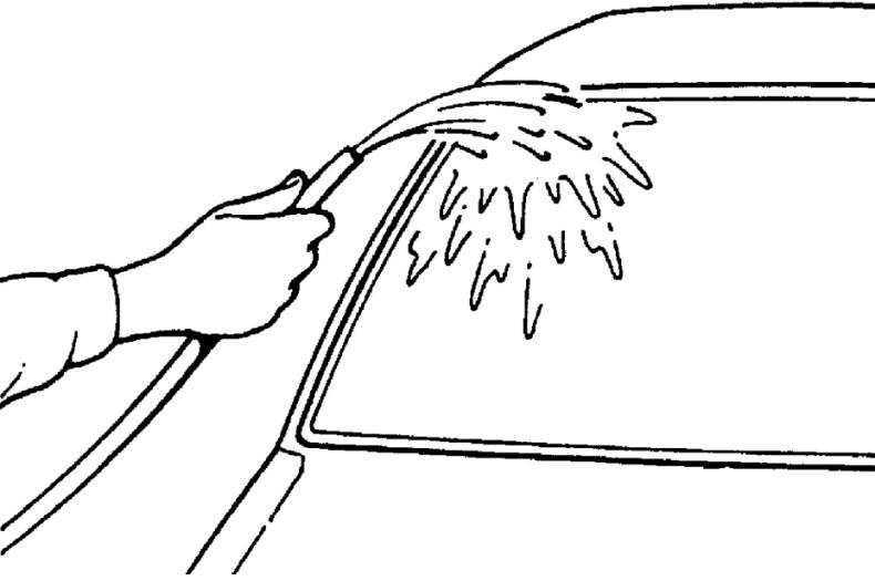 12. Check for water leakage by pouring water over windshield through hose. If leakage is found, dry windshield and fill leaky point with adhesive. If water still leaks even after that, remove glass and start installation procedure all over again.