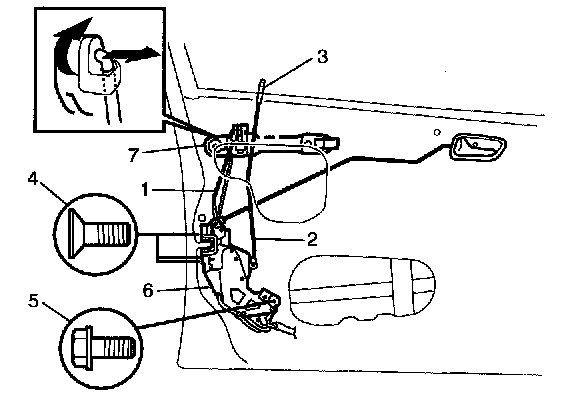 6. Loosen door latch screw (4), door latch actuator bolt (5) and remove door lock assembly (6).