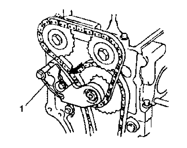 6) Remove timing chain tensioner adjuster No.2 (1) and gasket. To remove them, slacken 2nd timing chain by turning intake camshaft counterclockwise a little while pushing back pad.