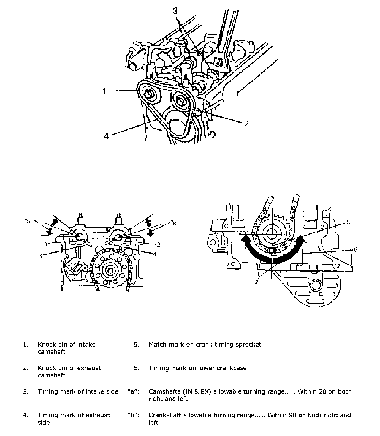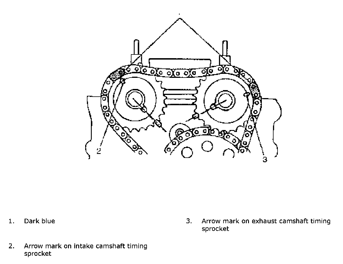 CAUTION: After 2nd timing chain is removed, never turn intake camshaft, exhaust camshaft and crankshaft independently more than such an extent as shown. If turned, interference may occur between piston and valves and valves themselves, and parts related to piston and valves may be damaged.