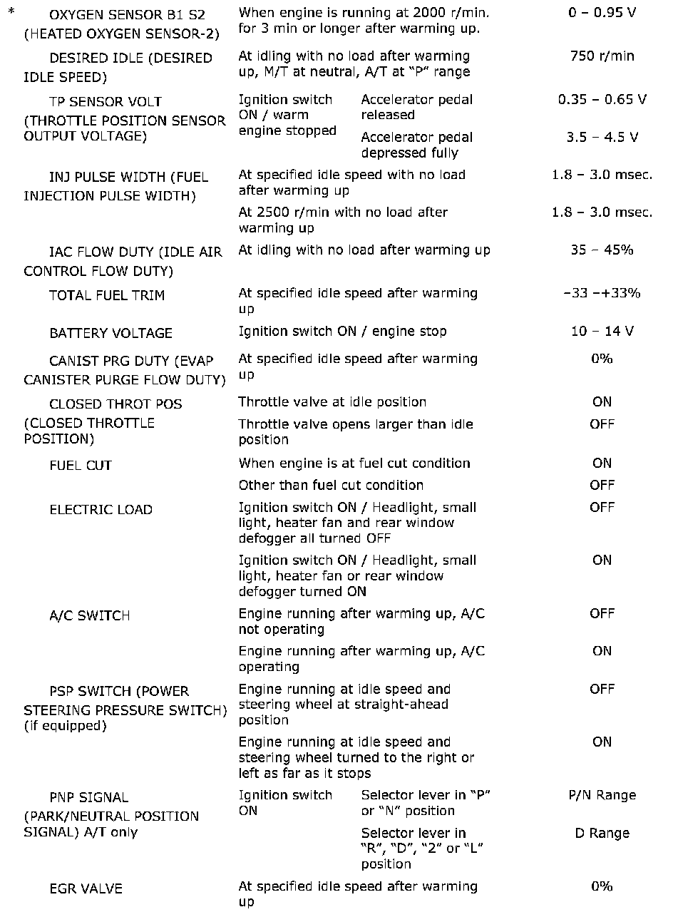 - When checking the data with the engine running at idle or racing, be sure to shift M/T gear to the neutral gear position and A/T gear to the "Park" position and pull the parking brake fully. Also, if nothing or "no load" is indicated, turn OFF A/C, all electric loads, P/S and all the other necessary switches.