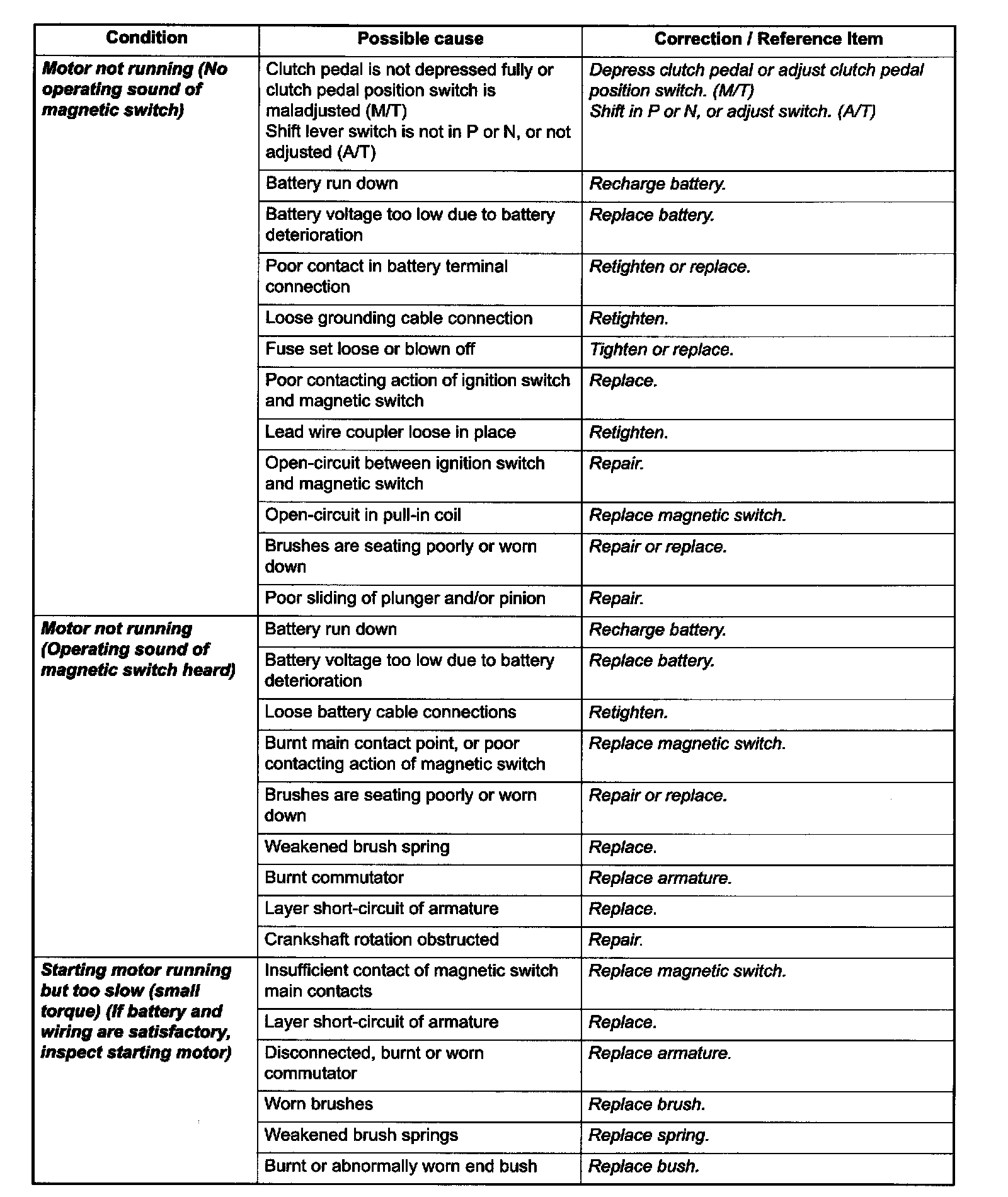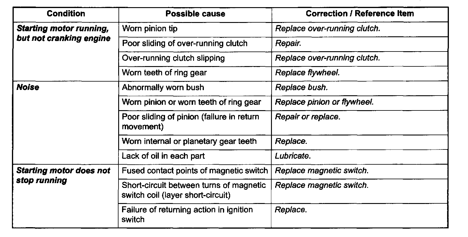 Possible symptoms due to starting system trouble would be as follows: