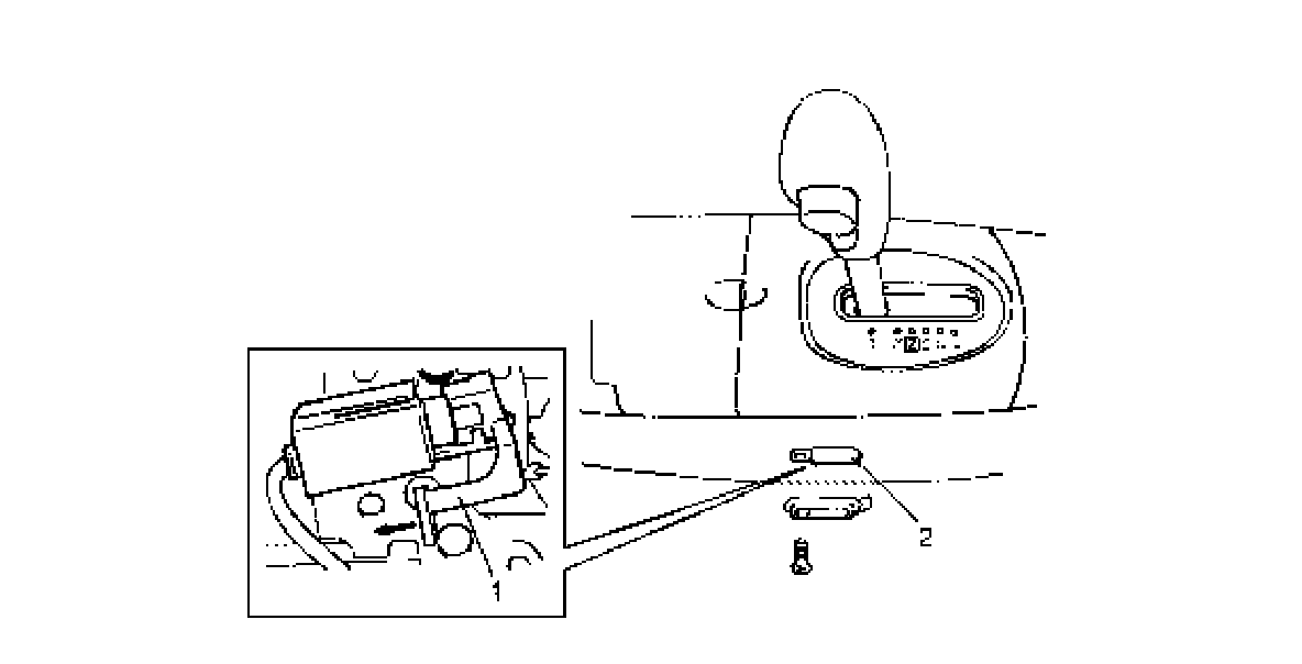 ^ With shift lock solenoid cam (1) moved in arrow direction and ignition key turned to ACC position, selector lever can be shifted from "P" range position to any other range.