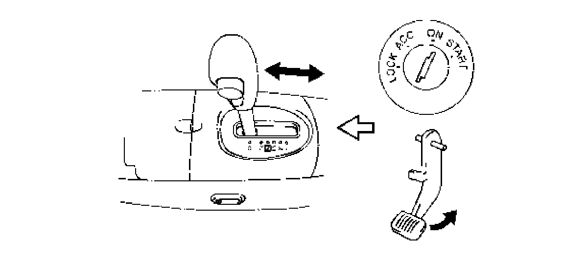 1. Check that selector lever cannot be moved to any other range from "P" range position when ignition switch key is at ACC position, at LOCK position (or it is removed from keyhole of ignition switch) or brake pedal is not depressed.