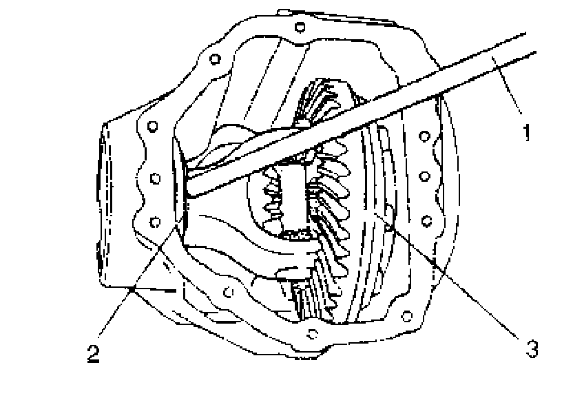 3. After applying differential oil to side bearings, install case assembly (2) in differential carrier (3).