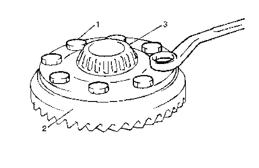5. Put bevel gear (2) on differential case (3) and fasten them with 8 bolts (1) by tightening them to specified torque.