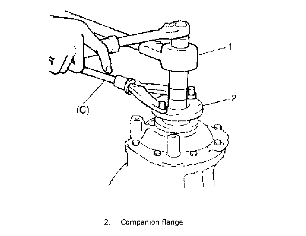 11. Remove companion flange (1) and washer from drive bevel pinion, and then drive out drive bevel pinion.