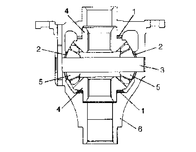 1. After applying differential oil to side gears (4), pinions (5), pinion shaft (3), side washers (1) and pinion washers (2), install them in differential case (6).