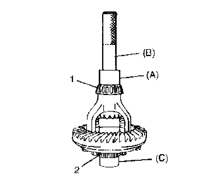 2. Hold bearing (2) press-fitted in Step 1 with holder and press-fit differential side bearing (1) on the other side.
