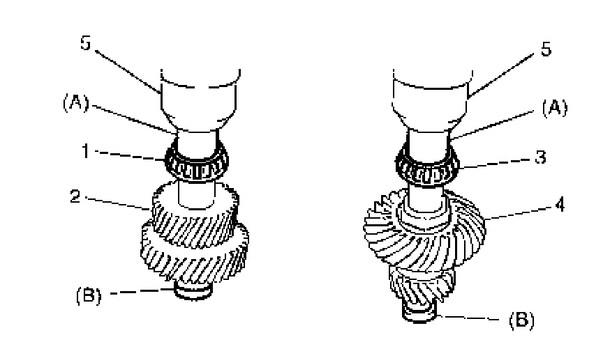 3. Drive in reduction driven gear bearings (3) (right and left) to reduction driven gear (4) by using special tools and hydraulic press (5).