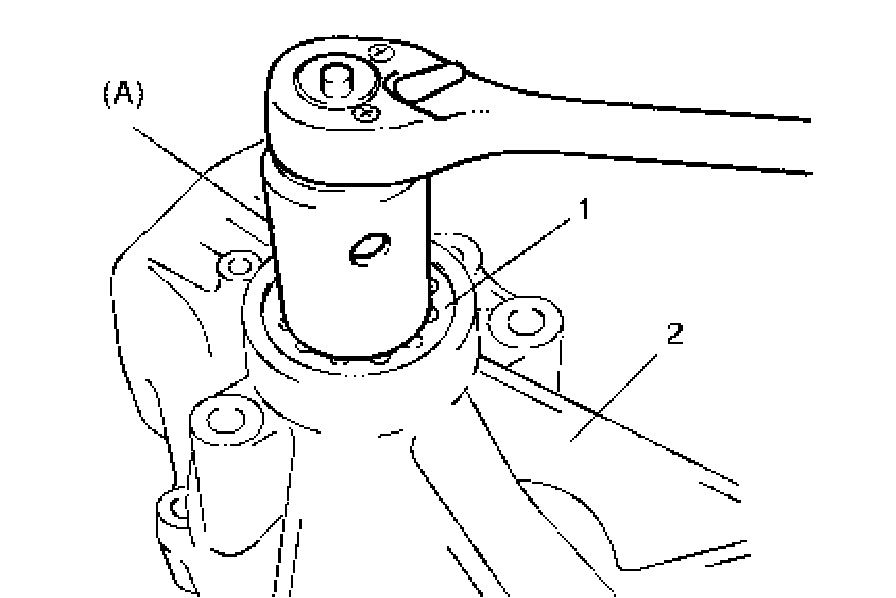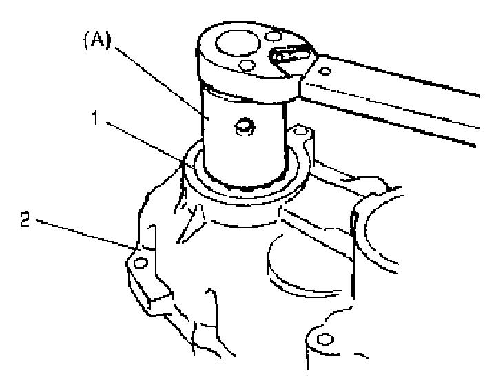 1. Screw bevel gear adjuster (1) on right case by using special tool while measuring starting torque of reduction drive gear (i.e., preload of reduction idler gear and driven gear taper roller bearings) by using special tool and torque wrench (2) until corrected starting torque value of reduction drive gear is in specified value shown as follows.