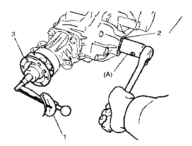 1. Install transfer output retainer assembly (1) with bevel pinion shims (2) selected in Transfer Bevel Pinion Shim Adjustment to transfer sub-assembly (3).