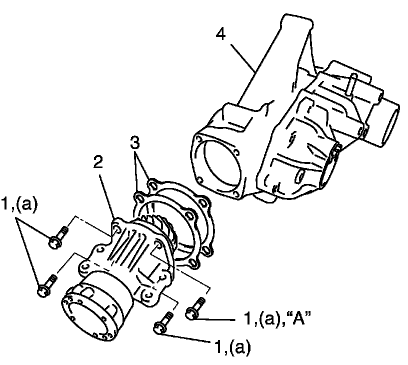 2. Install transfer output retainer assembly (2) with bevel pinion shims (3) selected in Transfer Bevel Pinion Shim Adjustment to transfer sub-assembly (4) by tightening retainer bolts (1) to specified torque.