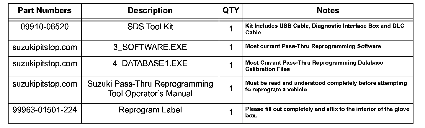 3. Following the procedure outlined in the Suzuki Pass-Thru Reprogramming Tool Operator's Manual, download and install the Pass-Thru Reprogramming Software "3_SOFTWARE.EXE" and the Suzuki Pass-Thru Reprogramming Data Base Calibration Files 4_DATABASE1.EXE" onto your PC.