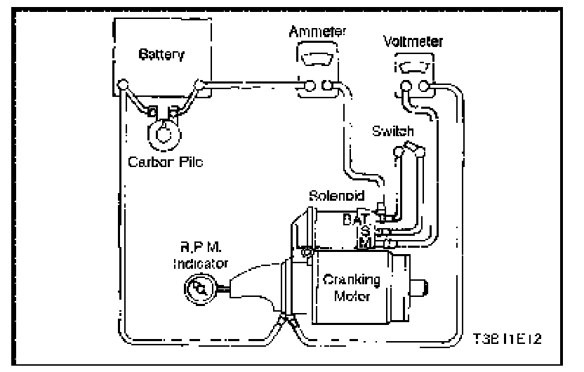 6. To begin the no-load test, close the switch and compare the rpm, the current, and the voltage readings with the specifications. Refer to Starter Specifications. Make disconnections only with the switch open. Use the test results as follows: