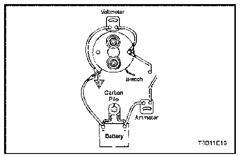3. Adjust the voltage to 10 volts. The ammeter reading should be 13 to 19 amperes.Current will decrease as the windings heat up. Current draw readings that are over specifications indicate shorted turns or a ground in the windings of the solenoid. Both conditions require replacement of the solenoid. Current draw readings that are under specifications indicate excessive resistance. No reading indicates an open circuit.