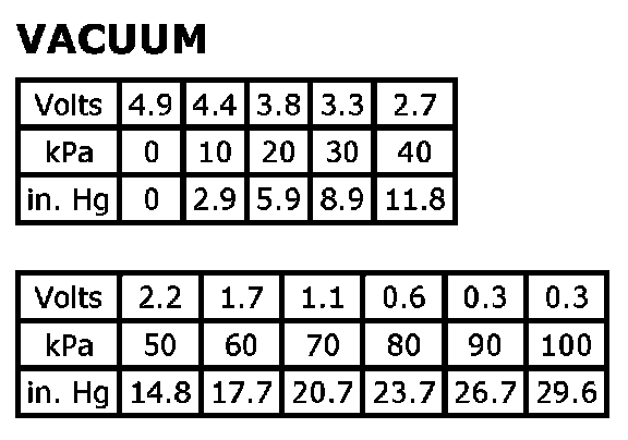 The above tables show the difference between absolute pressure and vacuum related to MAP sensor output, which appears as the top row of both tables.