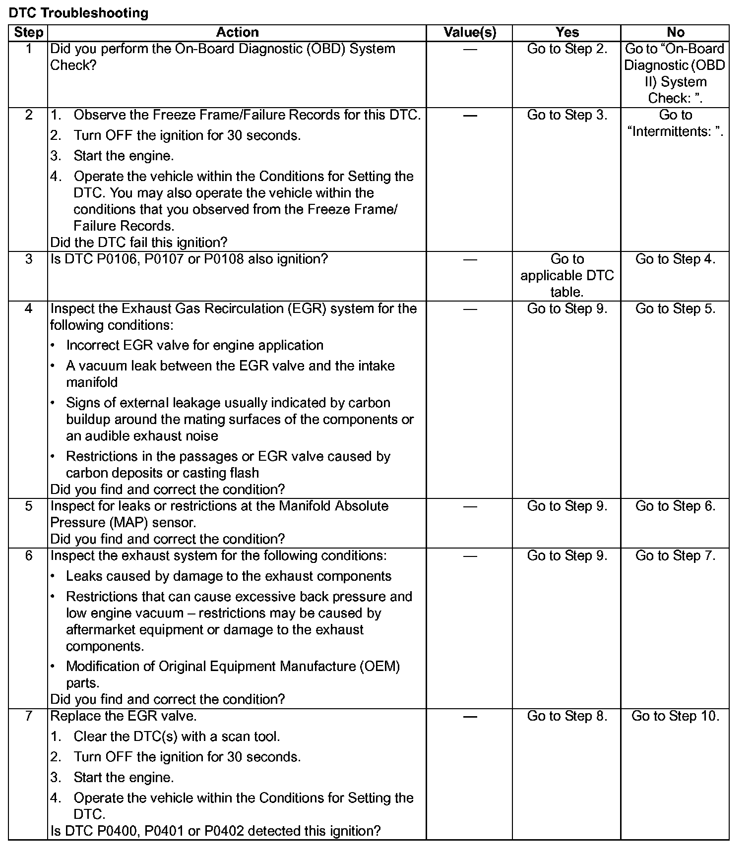 CORRECTION: The service manual has been updated to combine the EGR DTC P0400, P0401 and P0402 troubleshooting chart into one chart for all three DTCs. Please use the attached chart when diagnosing any of these DTCs.