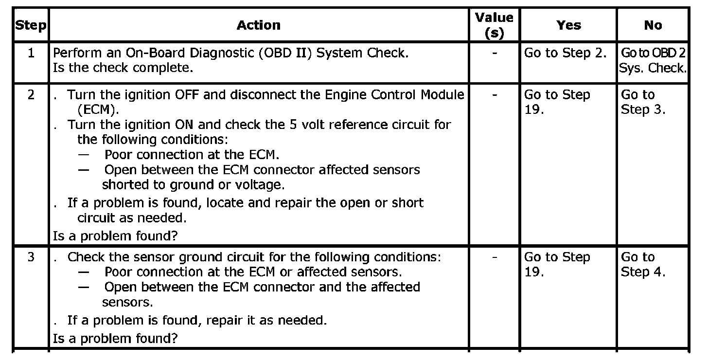 A short to ground in the 5 volt reference circuit or an open in the 5 volt reference circuit between the ECM and the splice will cause one or more of the following DTCs to be set: P0107, P0112, P0117, P0122.