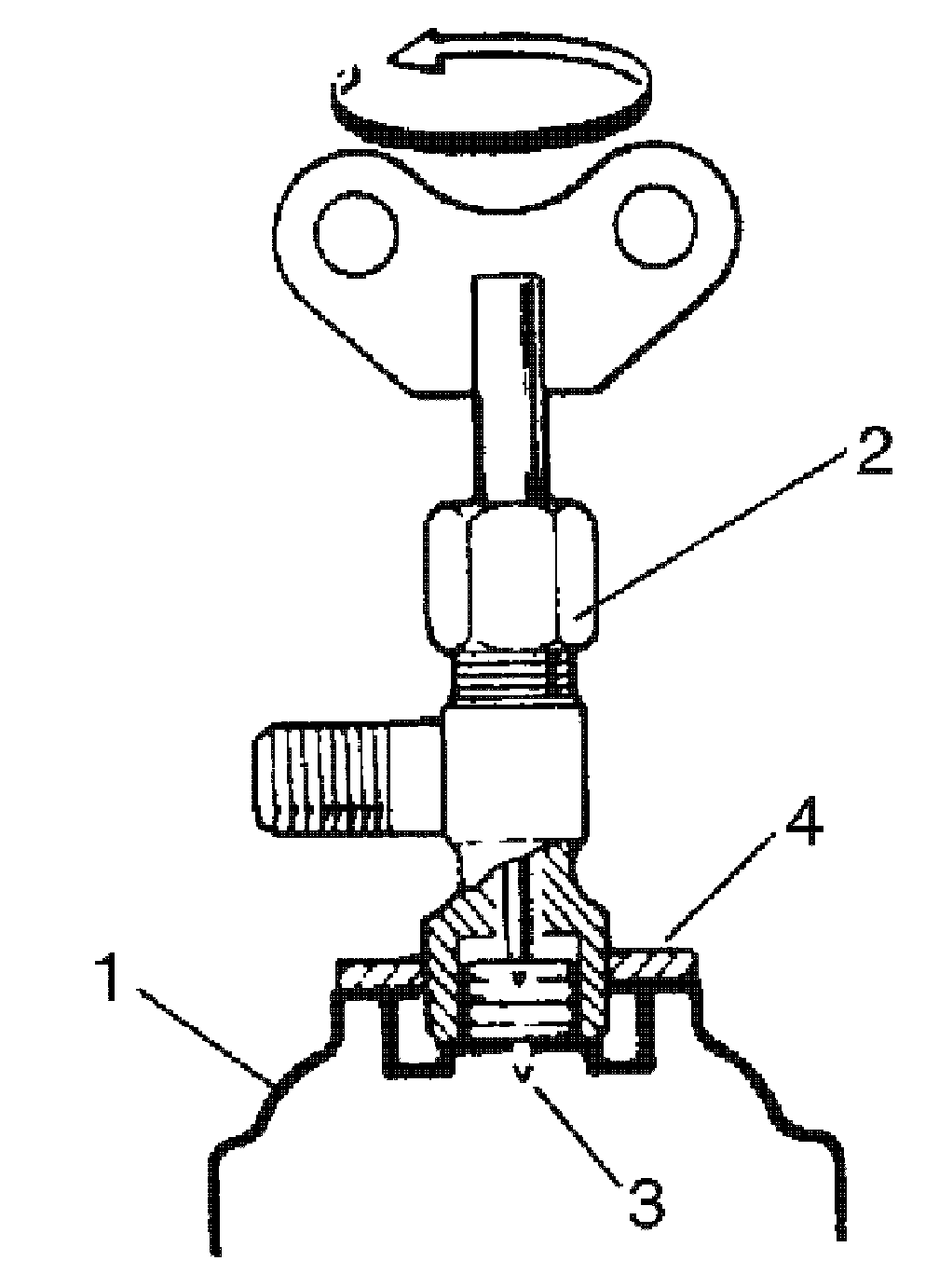 a. Retract needle (3) and remove refrigerant container tap valve (2) by loosening its plate nut (4).