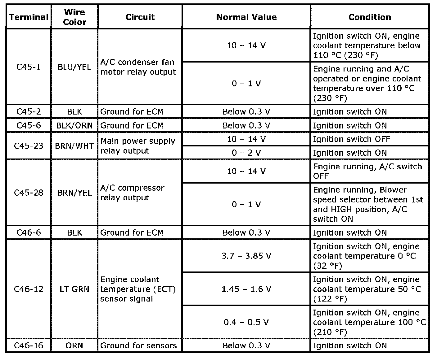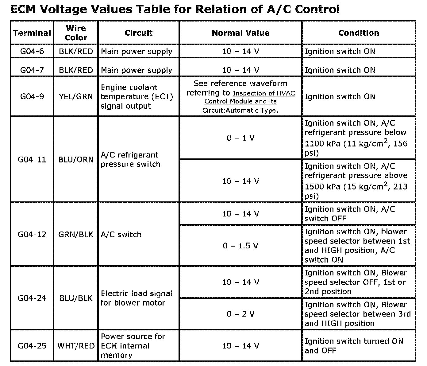 ECM Voltage Values Table for Relation of A/C Control