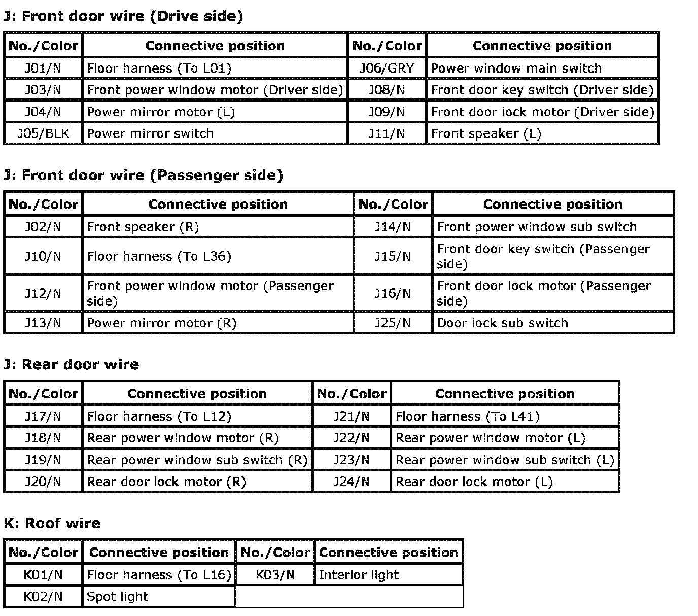 J: Front Door Wire, Rear Door Wire / K: Roof Wire Index: