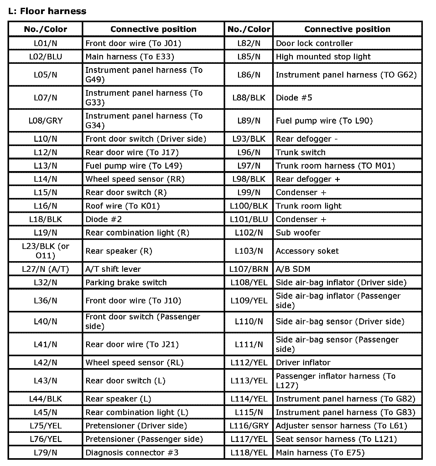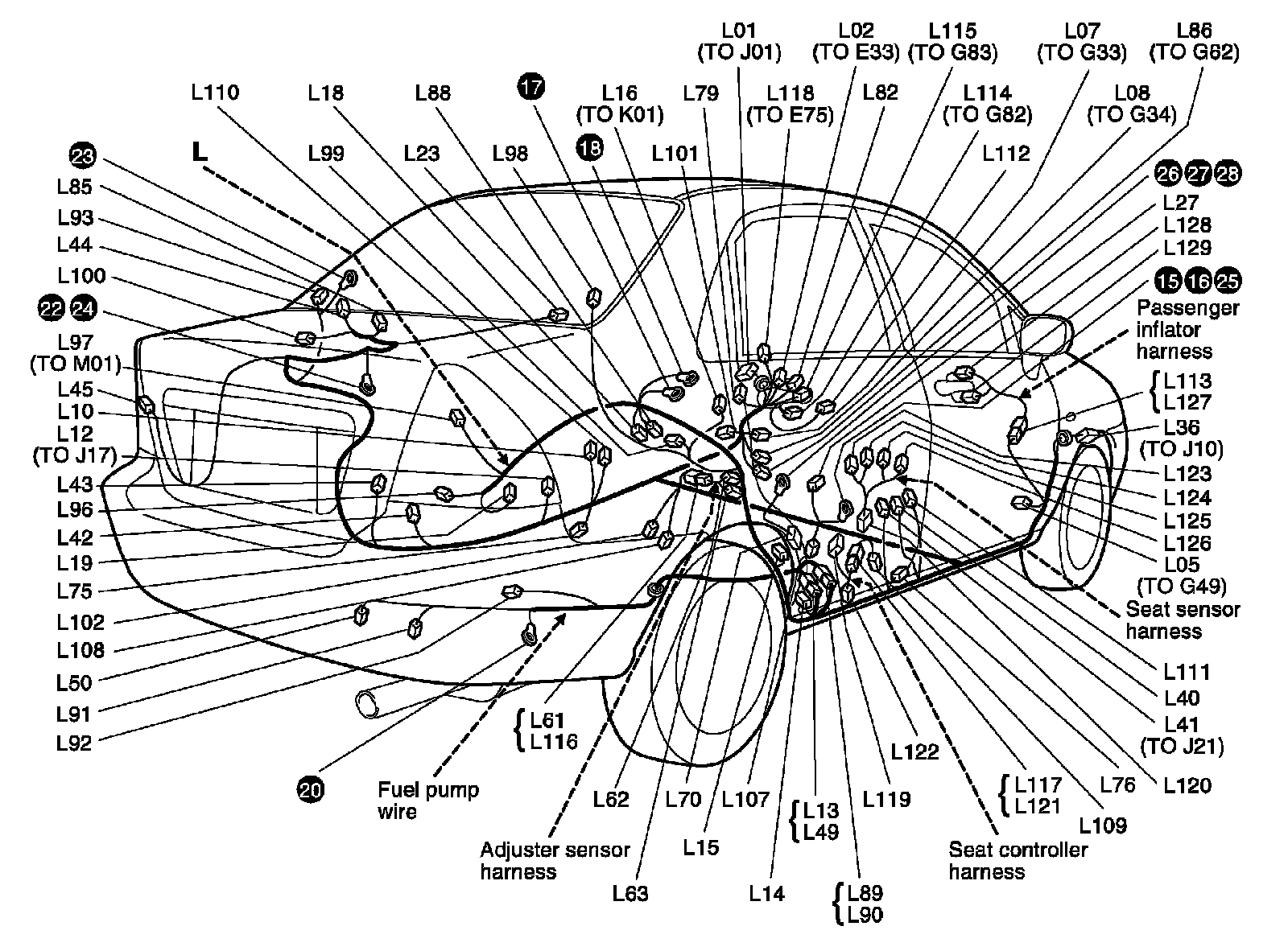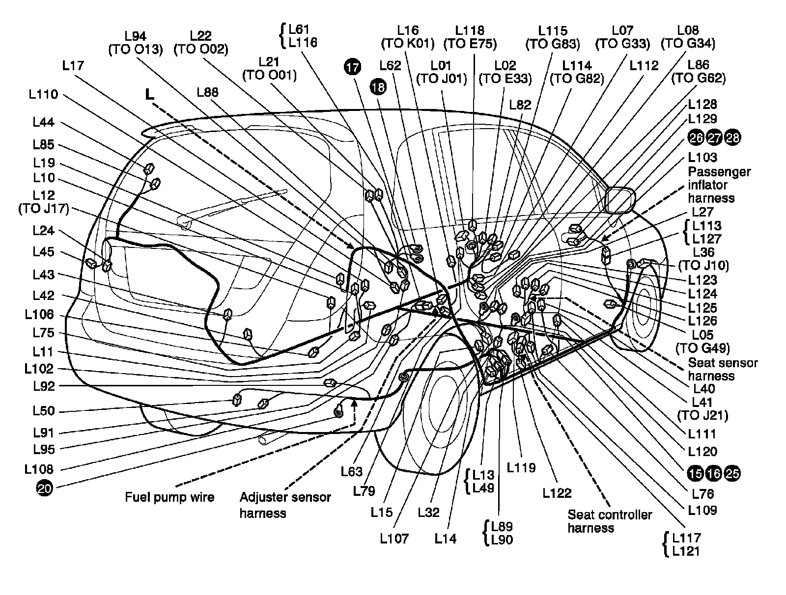 L: Floor Harness, Fuel Pump Wire, Adjuster Sensor Harness, Seat Controller Harness, Seat Sensor Harness, Passenger Harness (Sedan) Index: