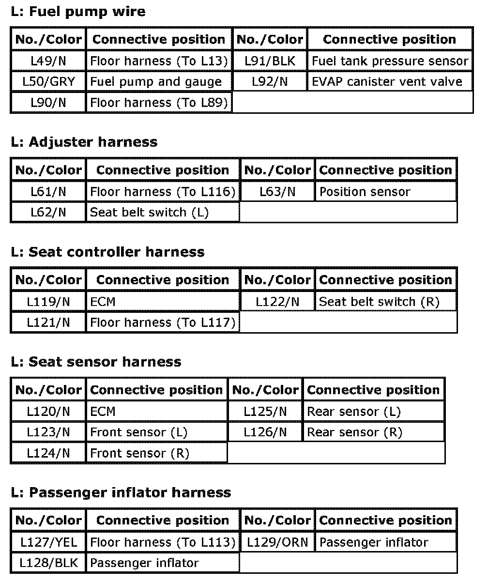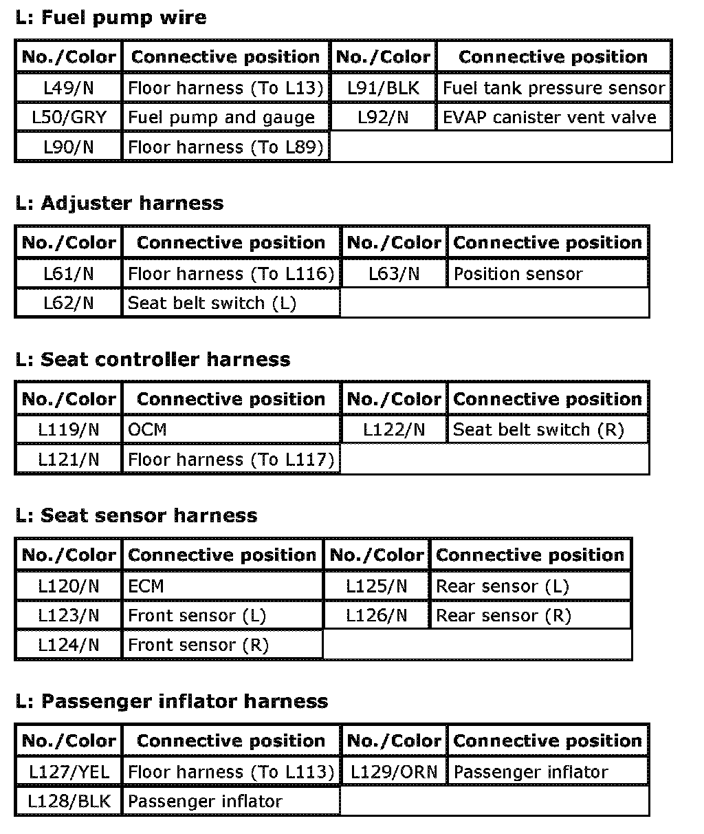 L: Floor Harness, Fuel Pump Wire, Adjuster Sensor Harness, Seat Controller Harness, Seat Sensor Harness, Passenger Harness (Sedan) View:
