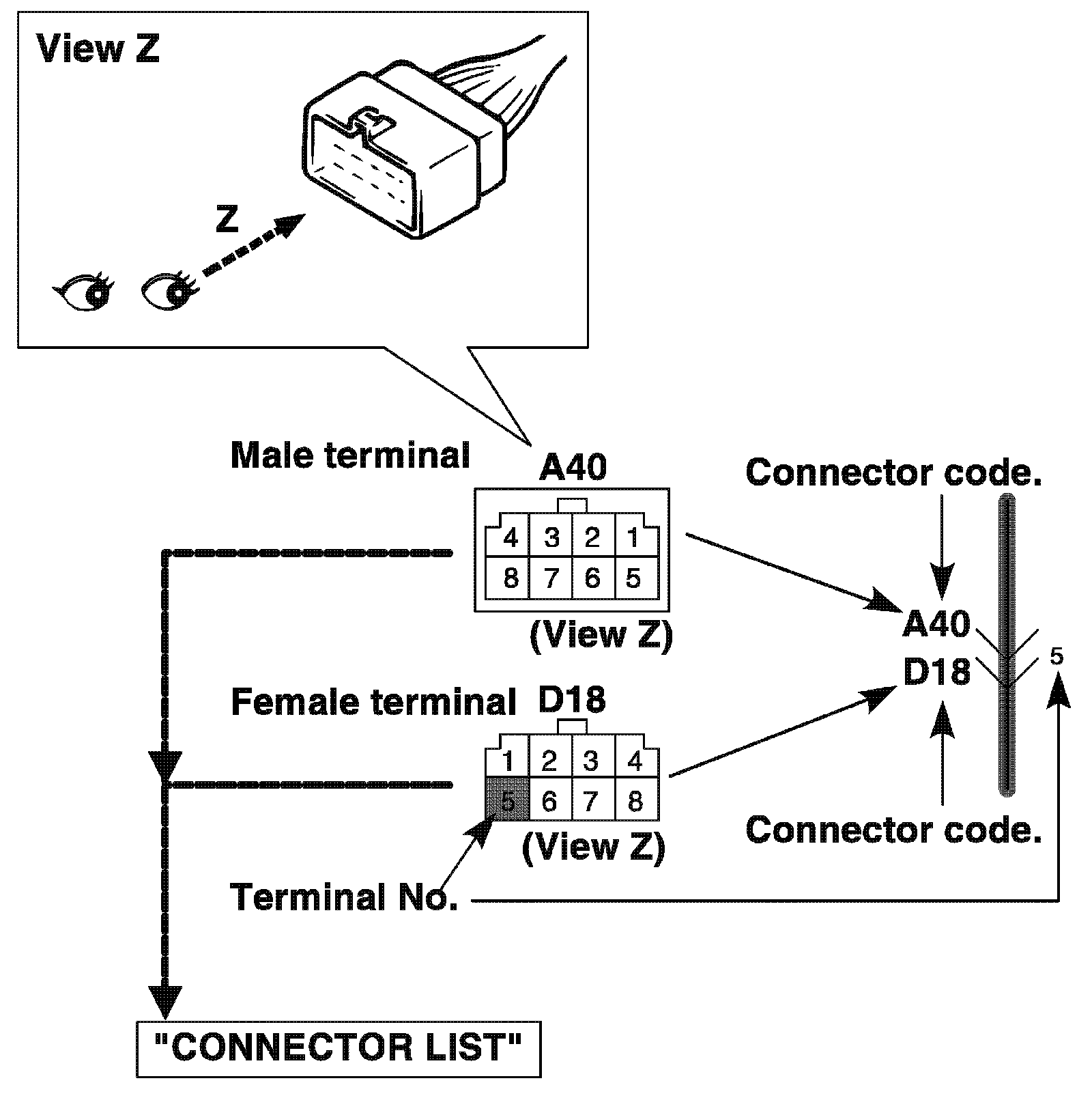 - The connector shape and terminal layout shown in this information are those when viewed from "Z" in the illustration.