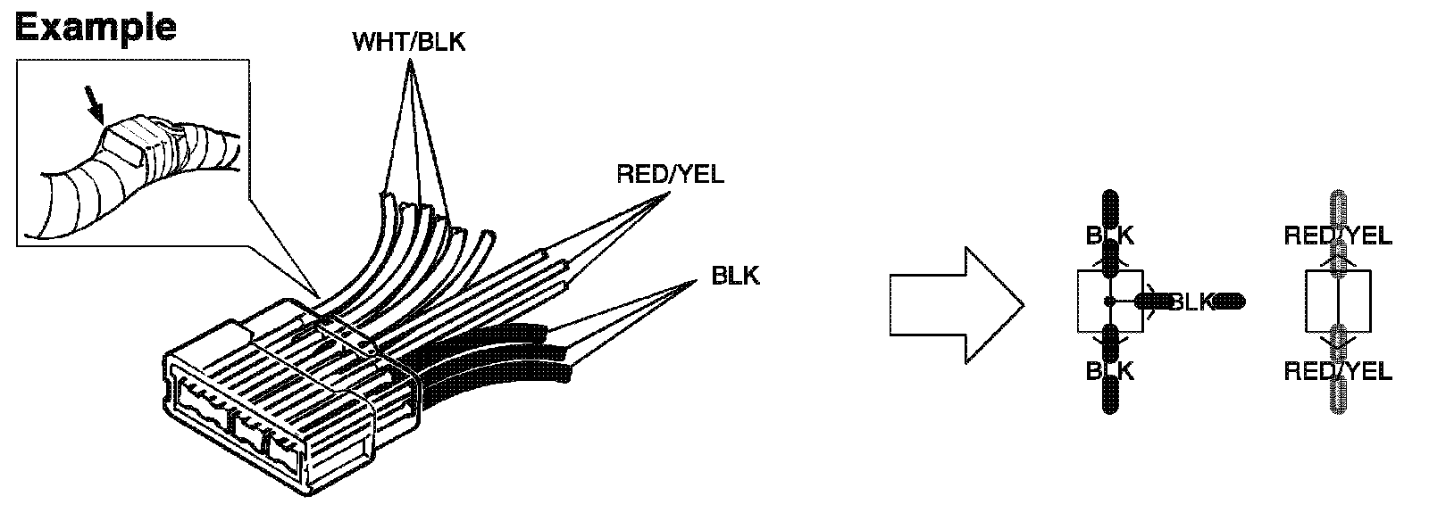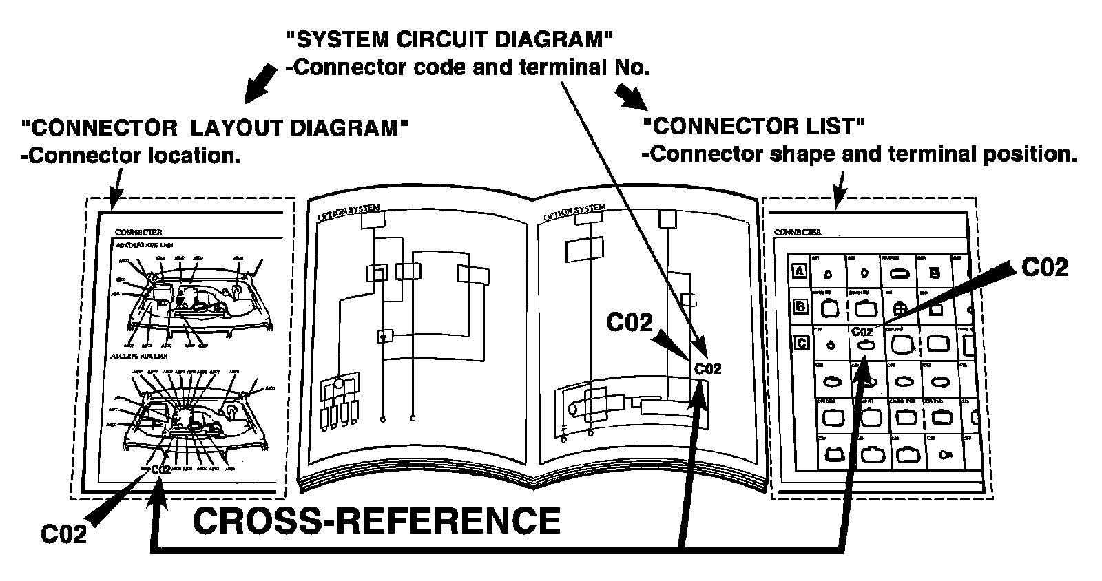 HOW TO READ CONNECTOR CODES AND TERMINAL NOS.1. Connector code/Terminal No./Terminal layout