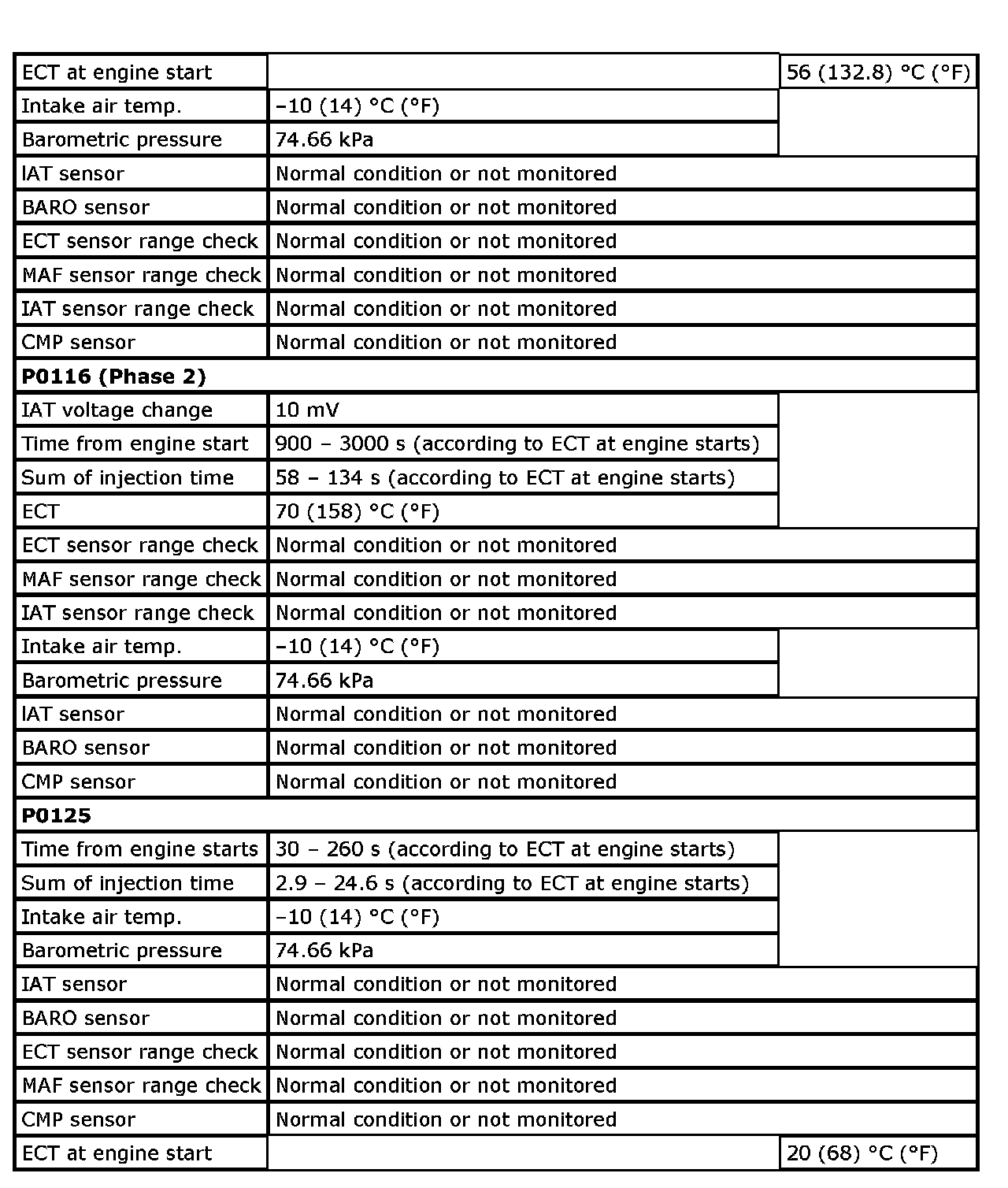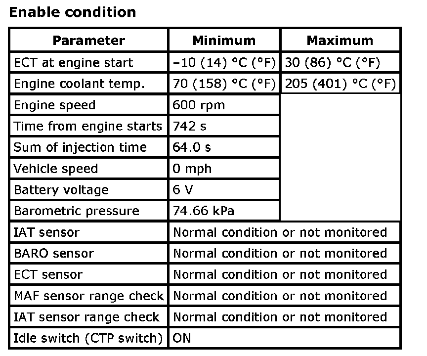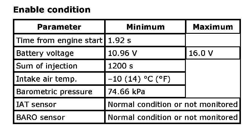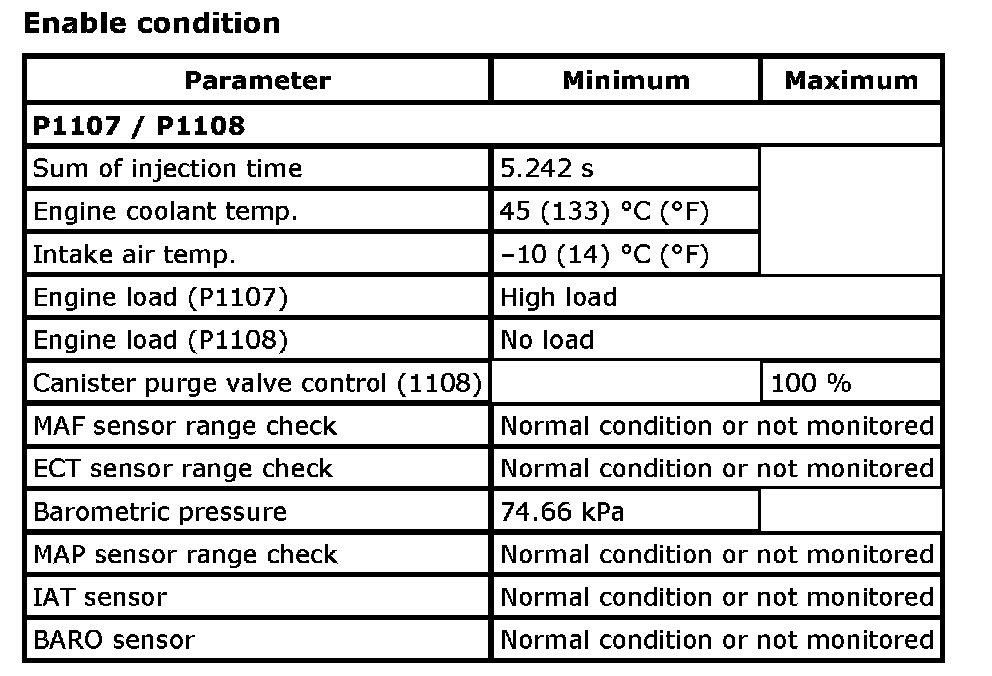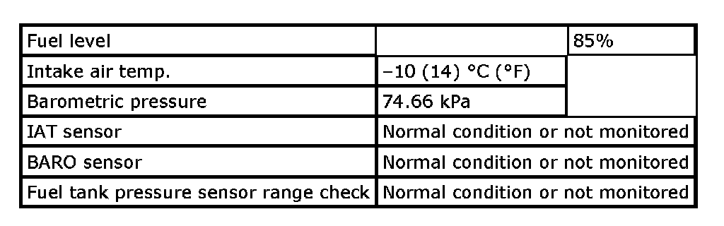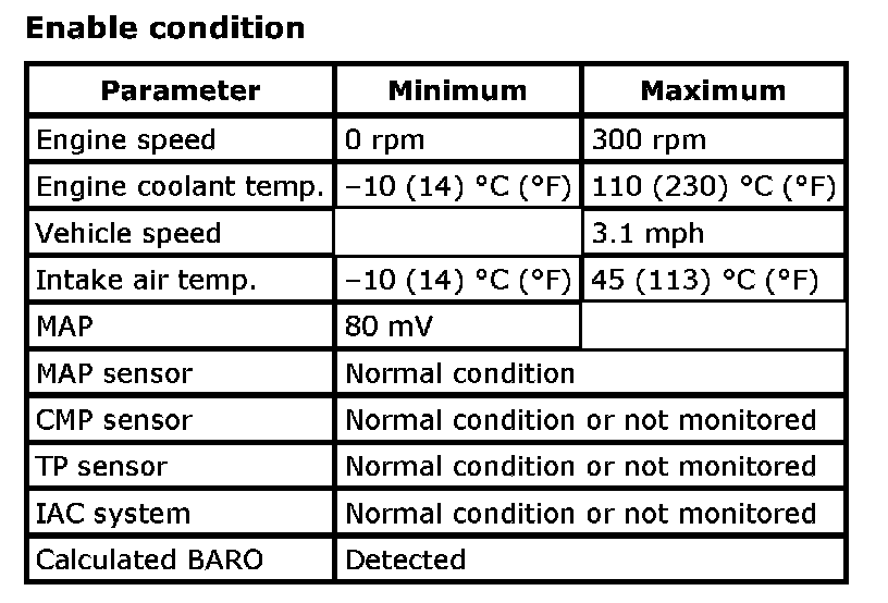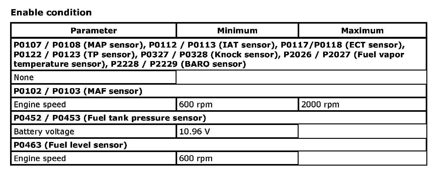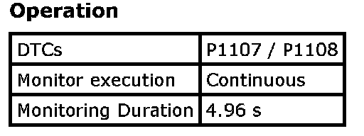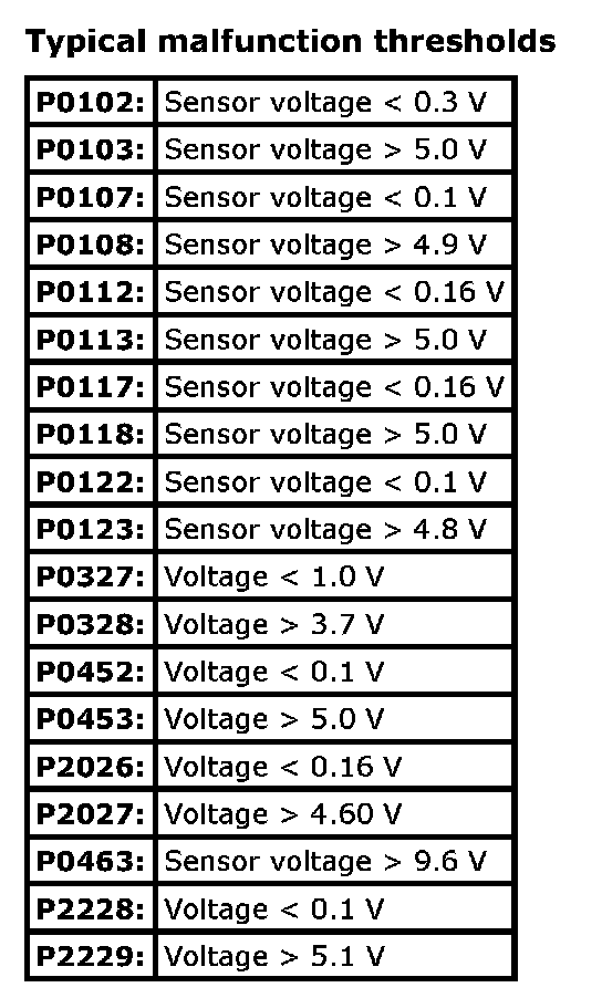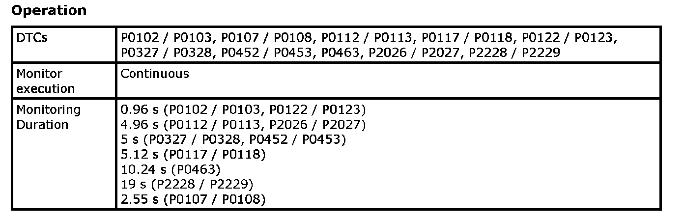 Input signals of MAF (P0102 / P0103), MAP (P0107 / P0108 / P1107 / P1108), IAT (P0112 / P0113), ECT (P0117 / P0118), TP (P0122 / P0123), Knock sensor (P0327 / P0328), Fuel tank pressure sensor (P0452 / P0453), Fuel vapor temp. sensor (P2026 / P2027), Fuel level sensor (P0463) and Barometric pressure sensor (P2227 / P2228 / P2229) are checked for open, short of circuit by monitoring input voltage.