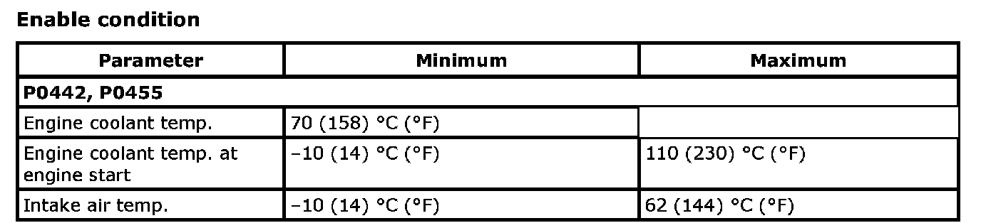 - Engine coolant temp. at engine start: Between 10 °C and 110 °C (14 °F and 230 °F)