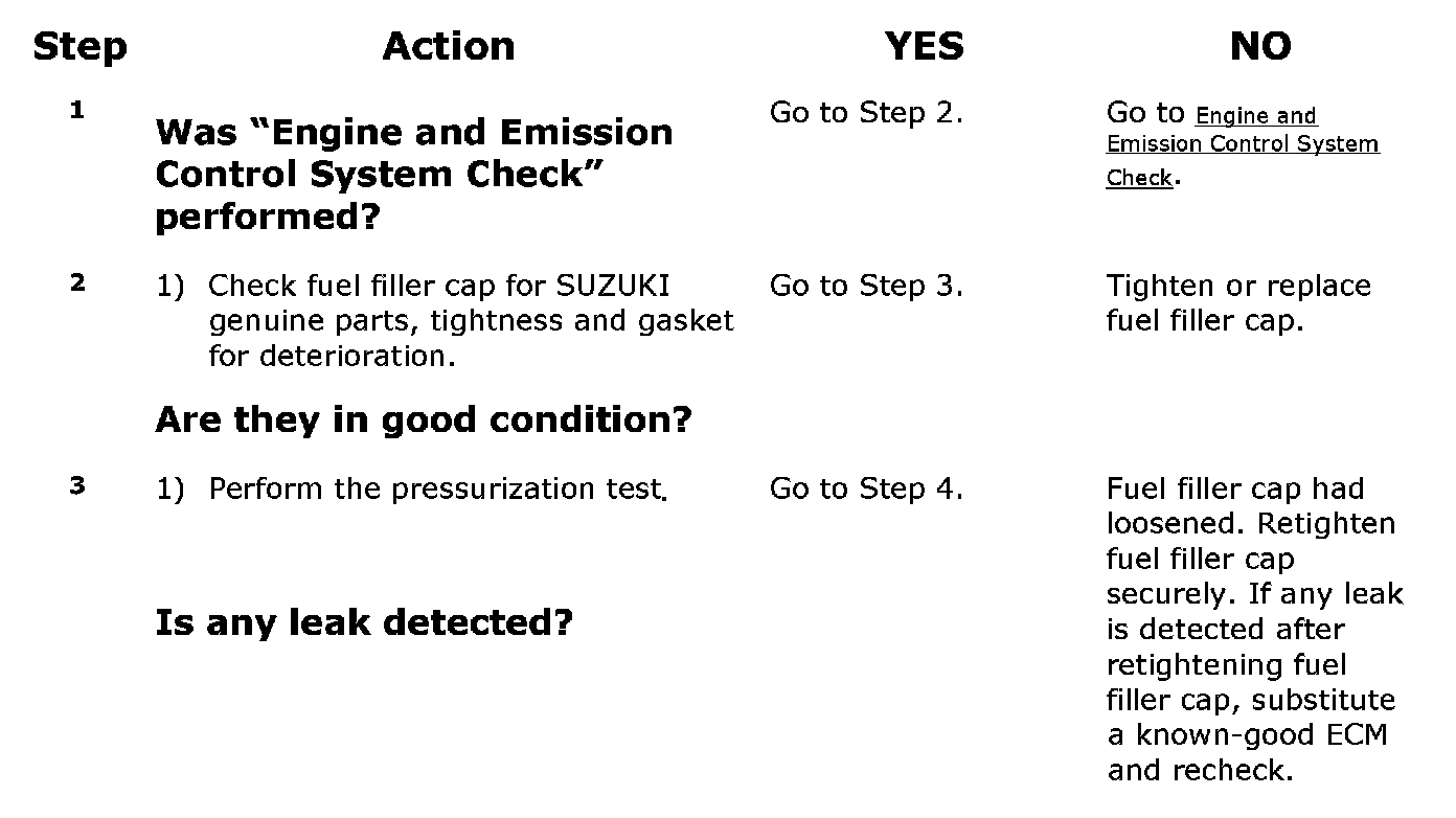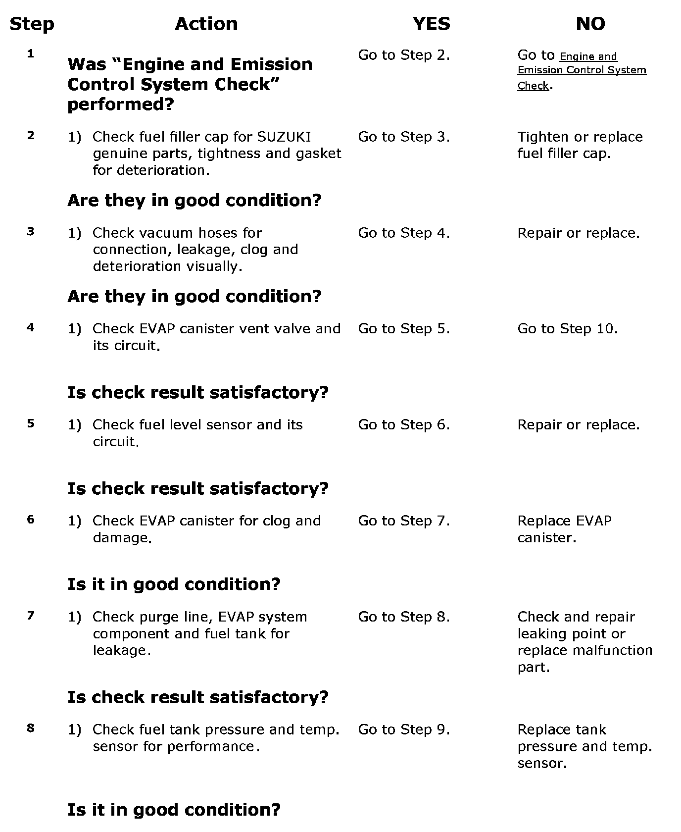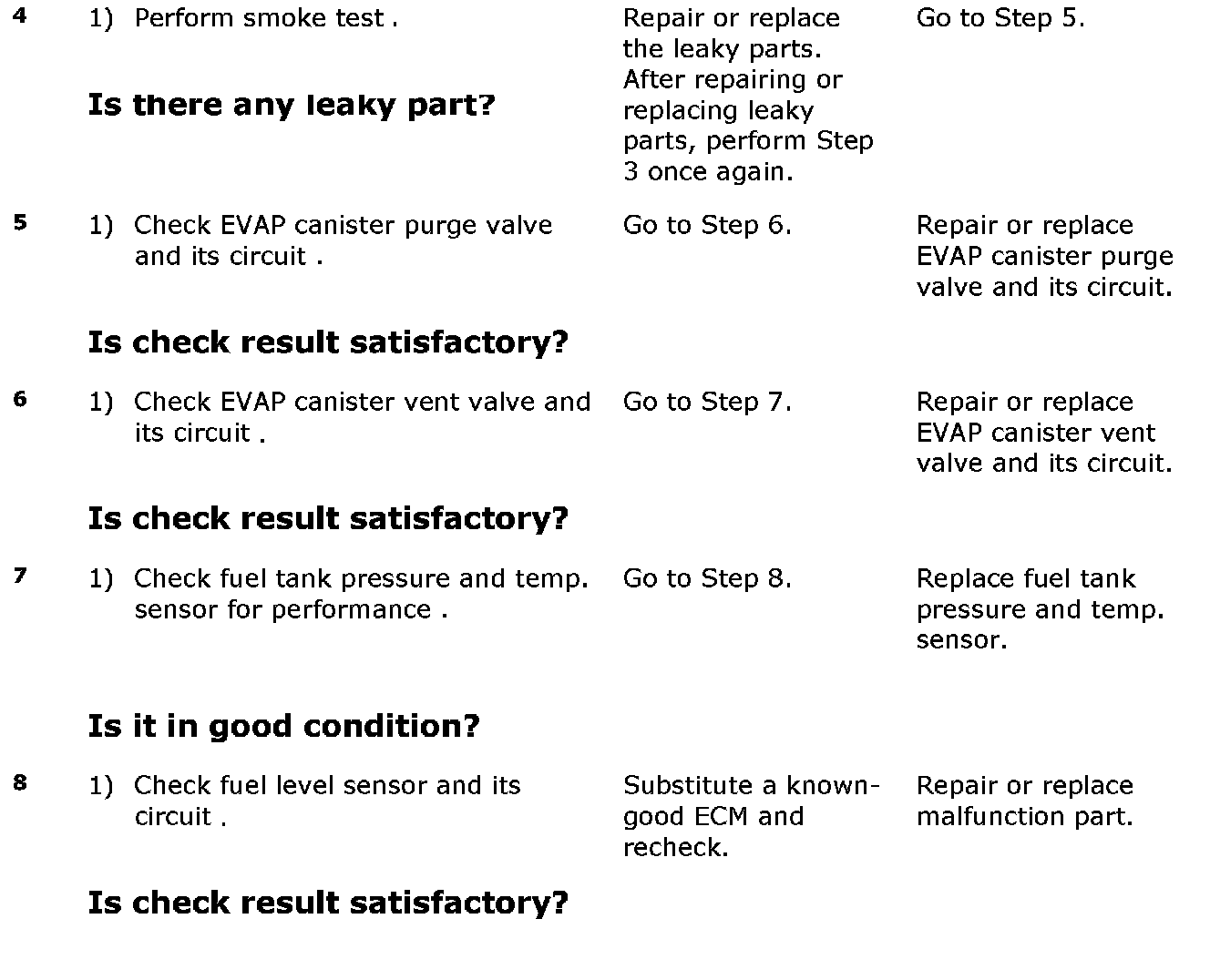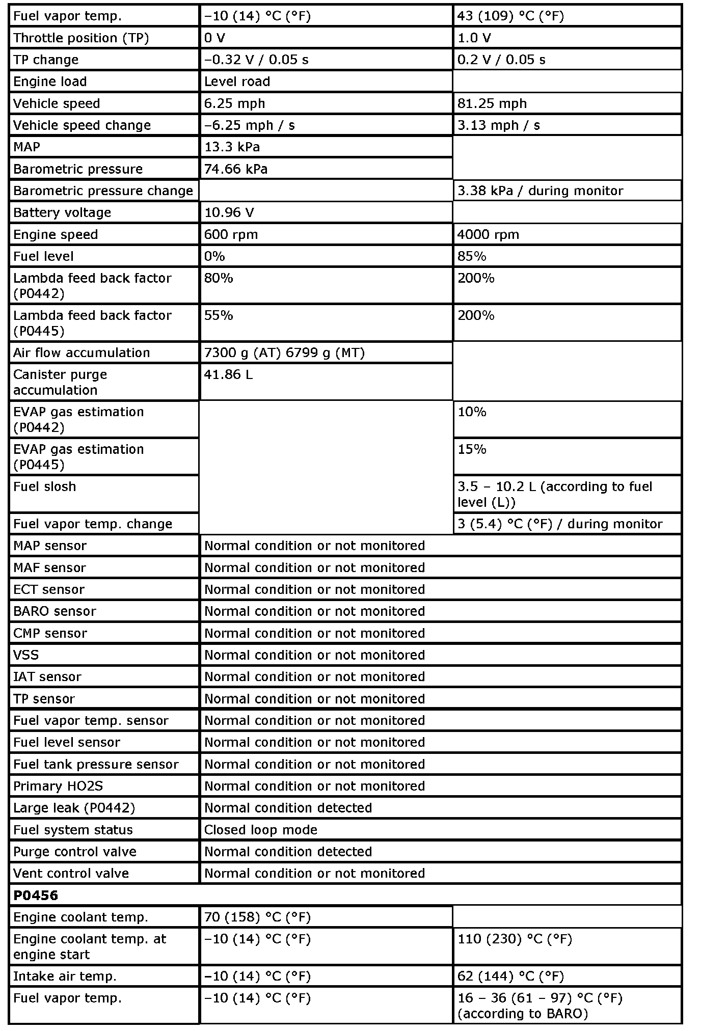 While engine running, ECM closes EVAP canister vent valve and opens EVAP canister purge valve. If EVAP control system is in good condition, EVAP control system pressure that detected by fuel pressure and temp. sensor becomes down. After that, ECM closes EVAP canister purge valve leaving EVAP canister vent valve is closed. If EVAP emission control system is in good condition, the fuel tank pressure rises specified rate.
