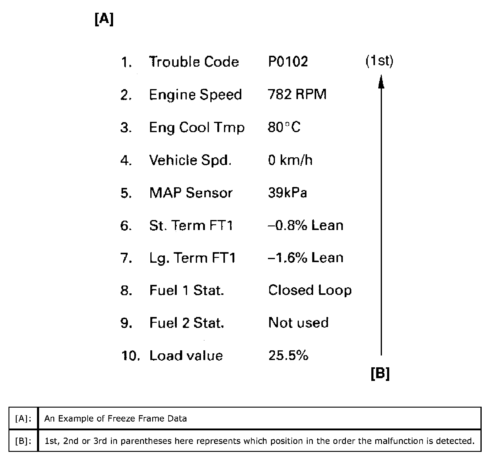 Therefore, it is possible to know engine and driving conditions (e.g., whether the engine was warm or not, where the vehicle was running or stopped, where air / fuel mixture was lean or rich) when a malfunction was detected by checking the freeze frame data. Also, ECM has a function to store each freeze frame data for three different malfunctions in the order as the malfunction is detected. Utilizing this function, it is possible to know the order of malfunctions that have been detected. Its use is helpful when rechecking or diagnosing a trouble.