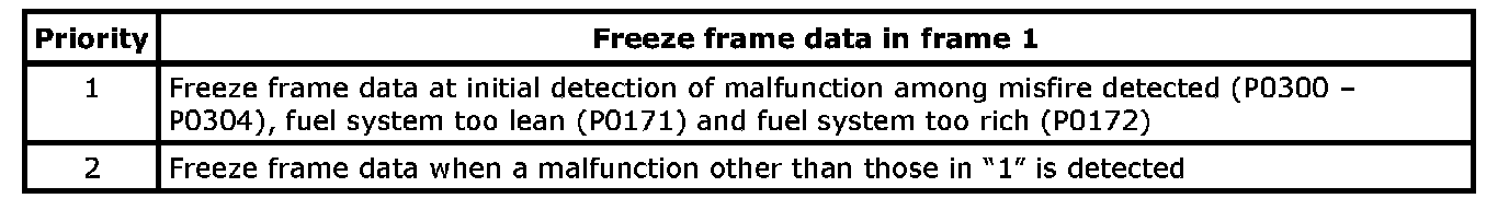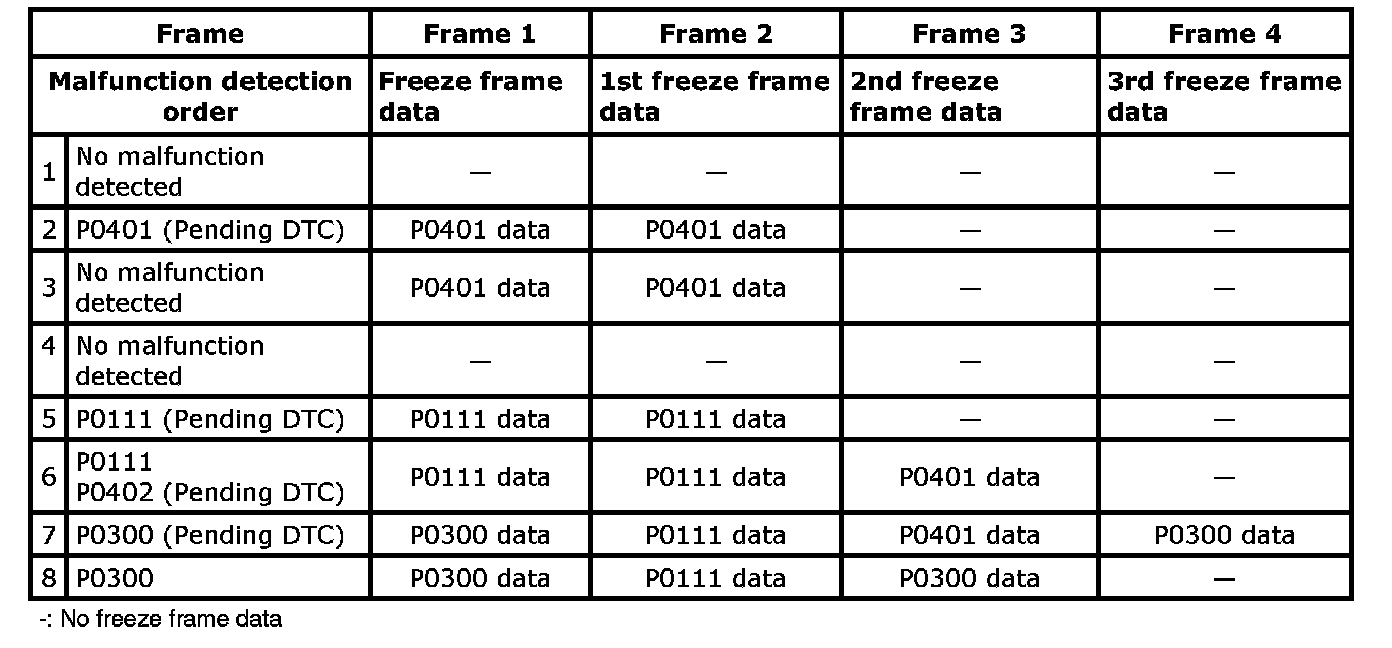 Shown in the table are examples of how freeze frame data are stored when two or more malfunctions are detected.
